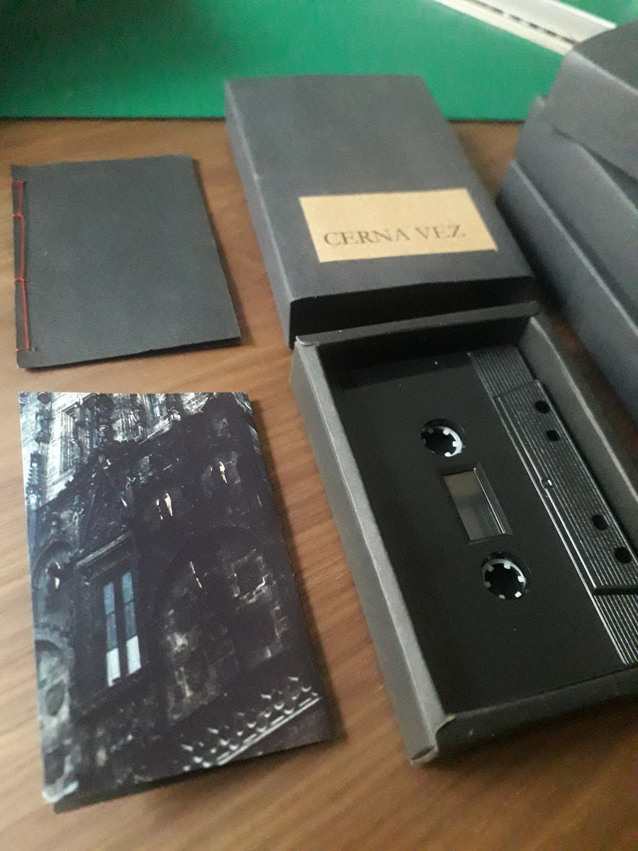 The first 5 tapes of the Cerna Vez release are featured in a black cardboard box with an extra handcratfed booklet made out of tracing paper